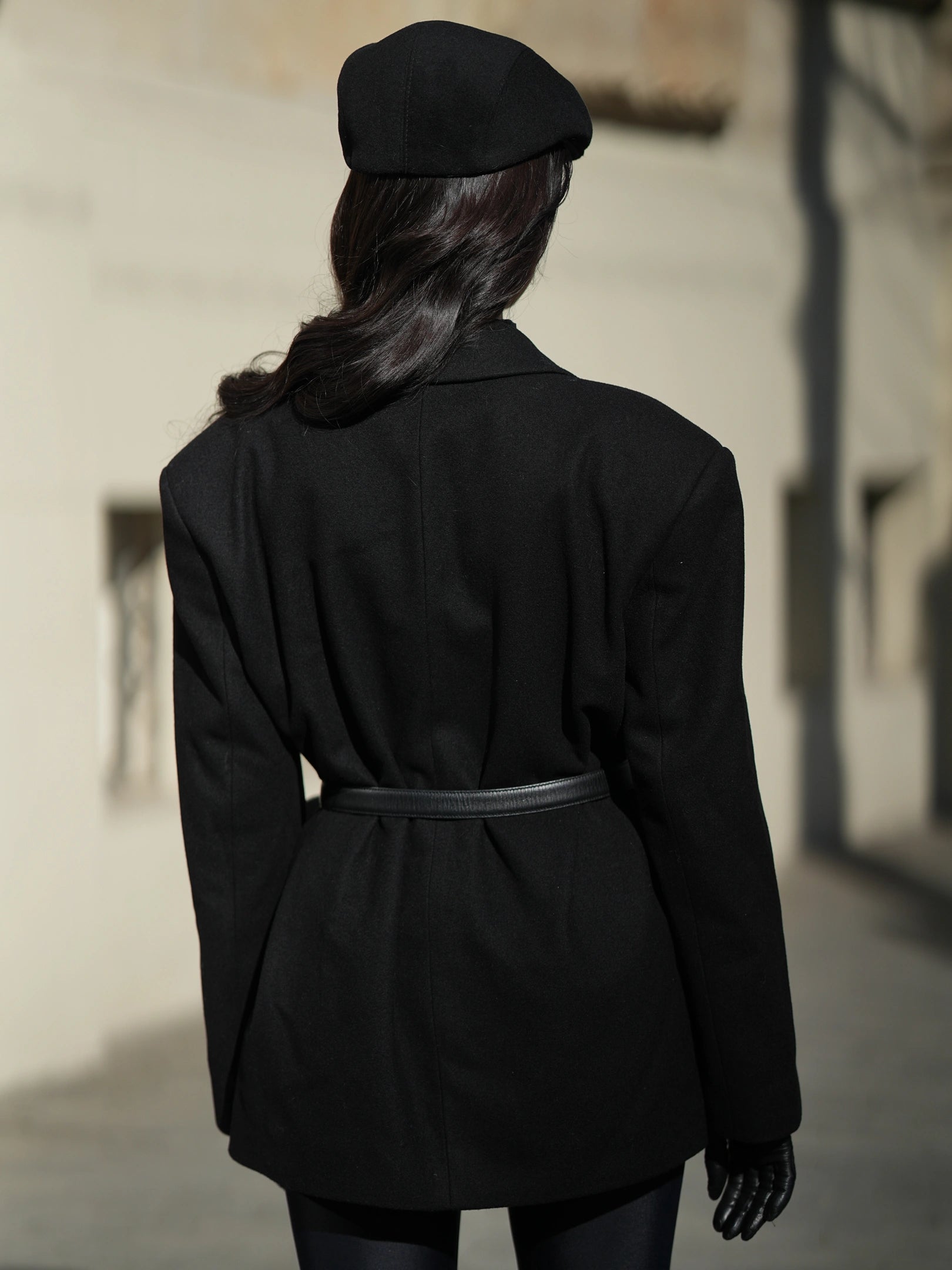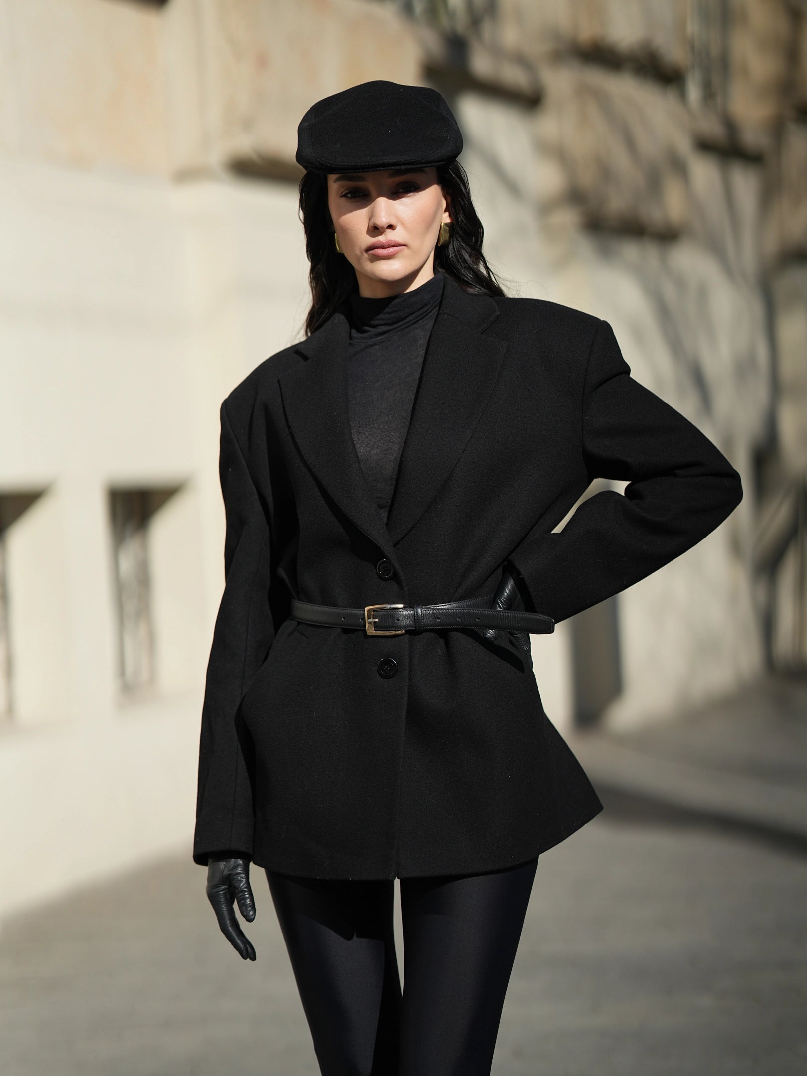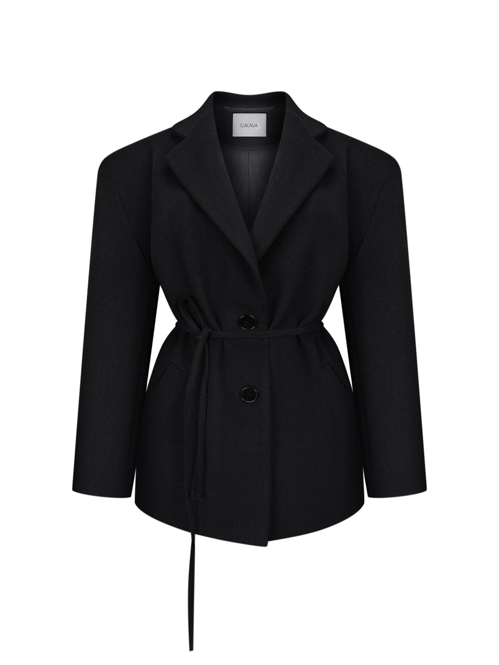 This coat features structured shoulders and is available in one size. It is secured with two large buttons and comes with a belt.