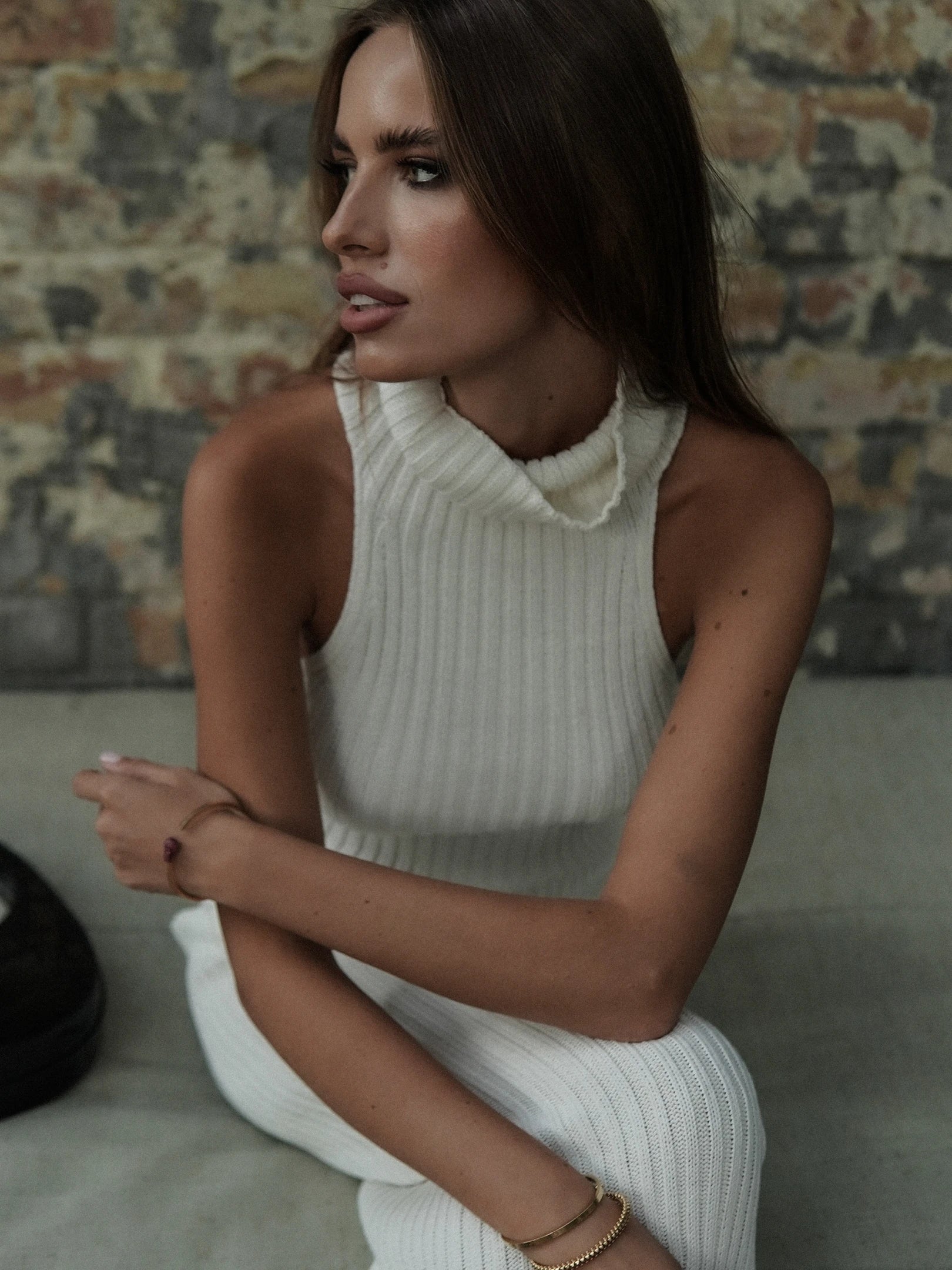 The beige silhouette dress is made from premium Italian yarn and is available in two lengths: 120 cm and 130 cm.