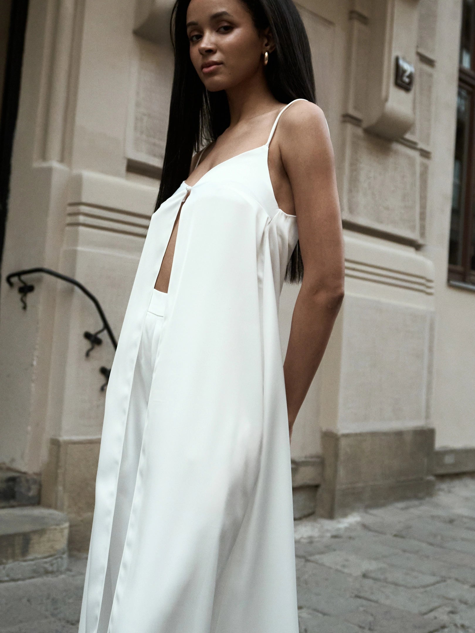 Elongated satin top with a flowing silhouette, deep neckline, and thin straps.