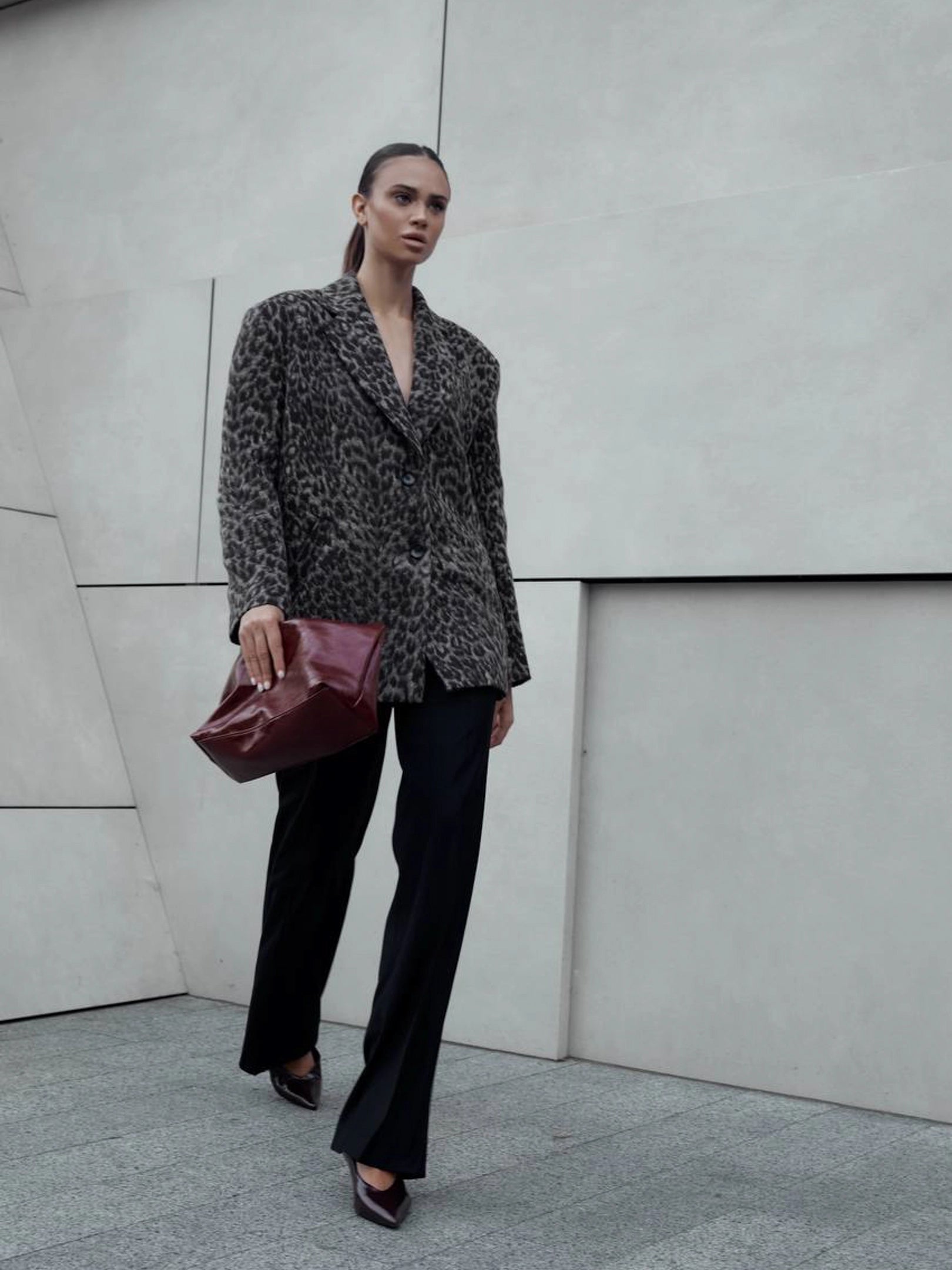 A wool jacket with an animalistic print is a bold accent in the wardrobe that embodies restrained provocation and strength of character. The silhouette is loose, with soft shoulders and a deep neckline that balances between classics and modern energy.