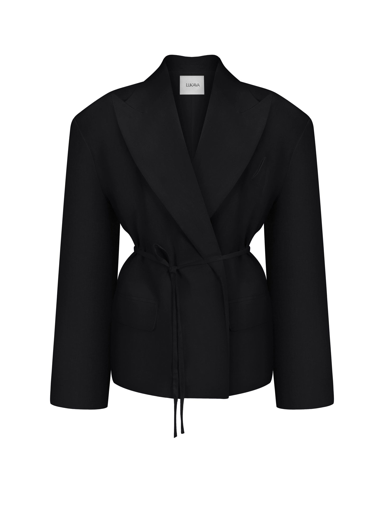 Oversized linen blazer with a relaxed fit and strong shoulders. No buttons, easy to style.