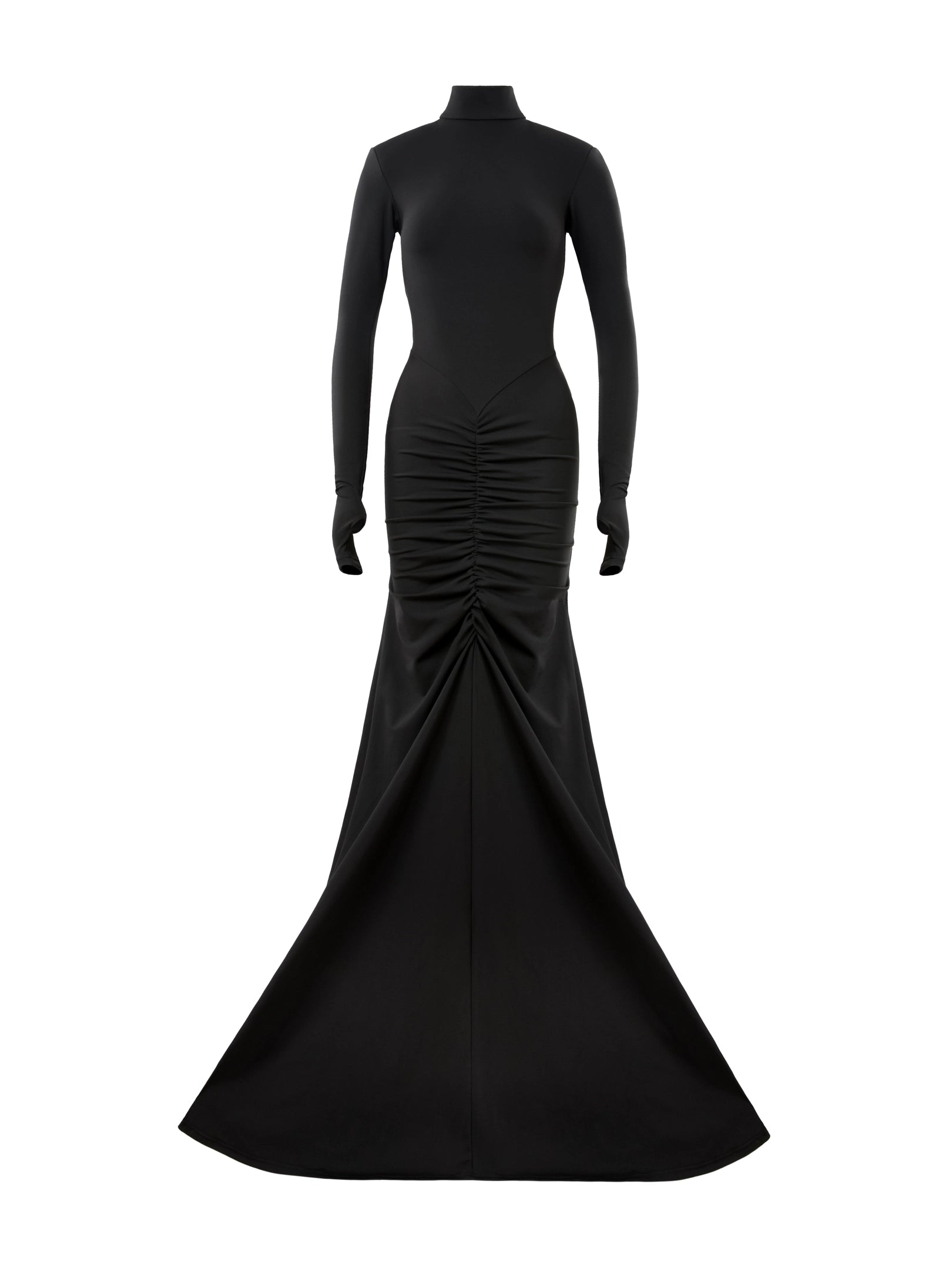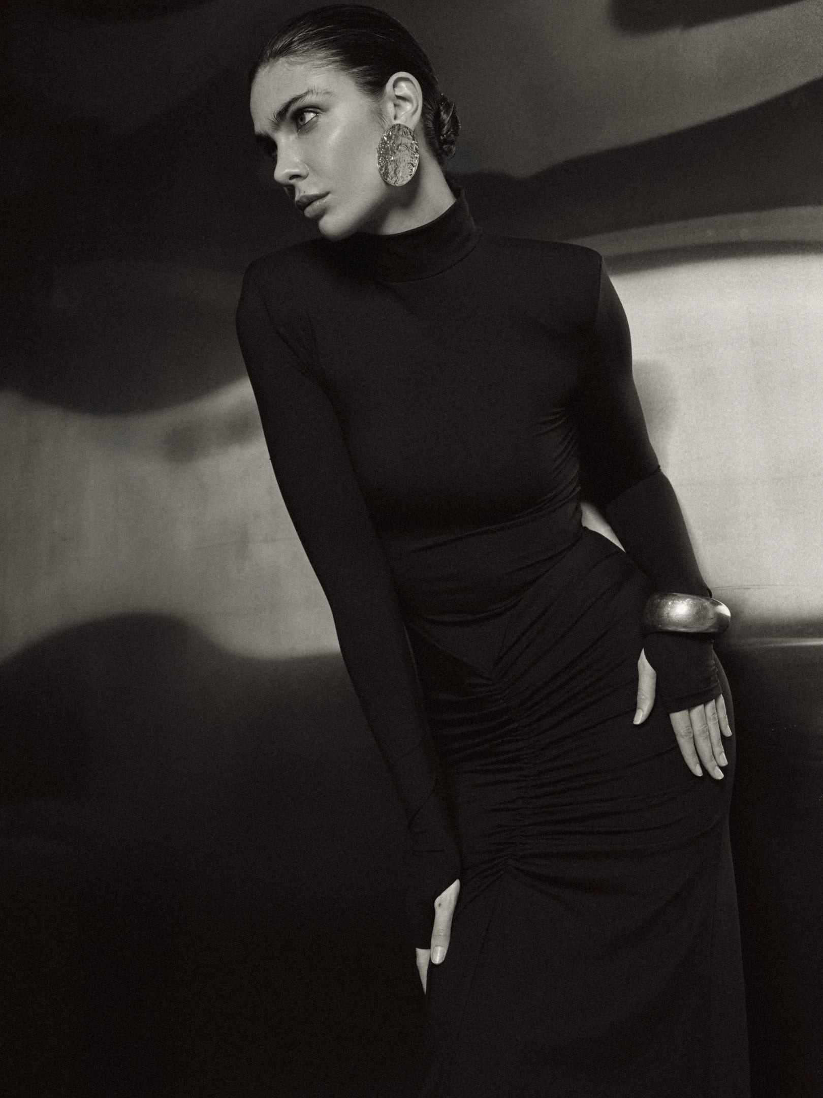 A fitted maxi dress crafted from insulated biflex fabric for comfort in cooler weather. Structured shoulders add definition, while the soft front gathering enhances the silhouette. Its sleek design makes it a versatile choice for special occasions and evening outings.