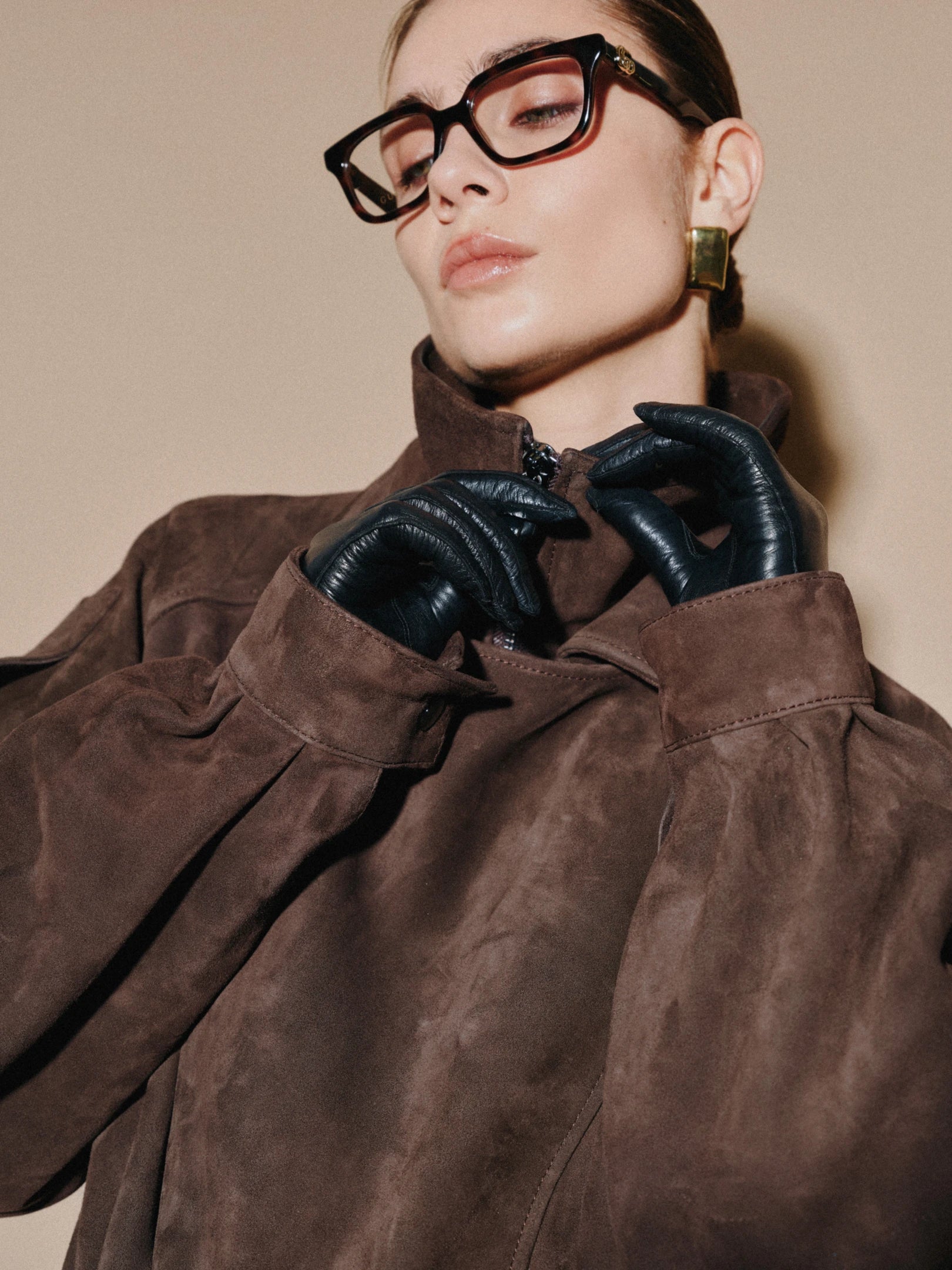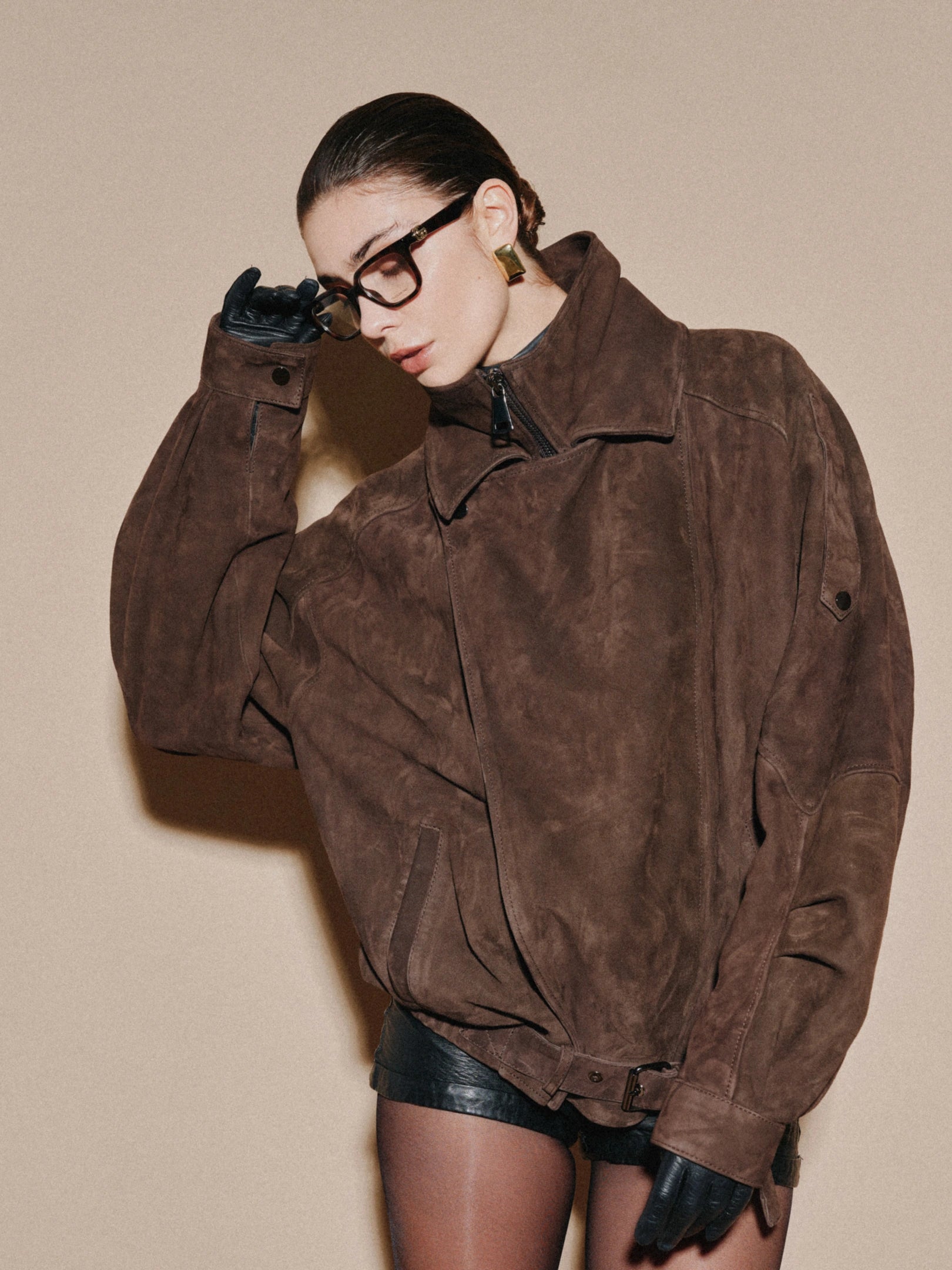 Elevate your style with our oversized bomber jacket, featuring asymmetric details and a double zip-up collar.