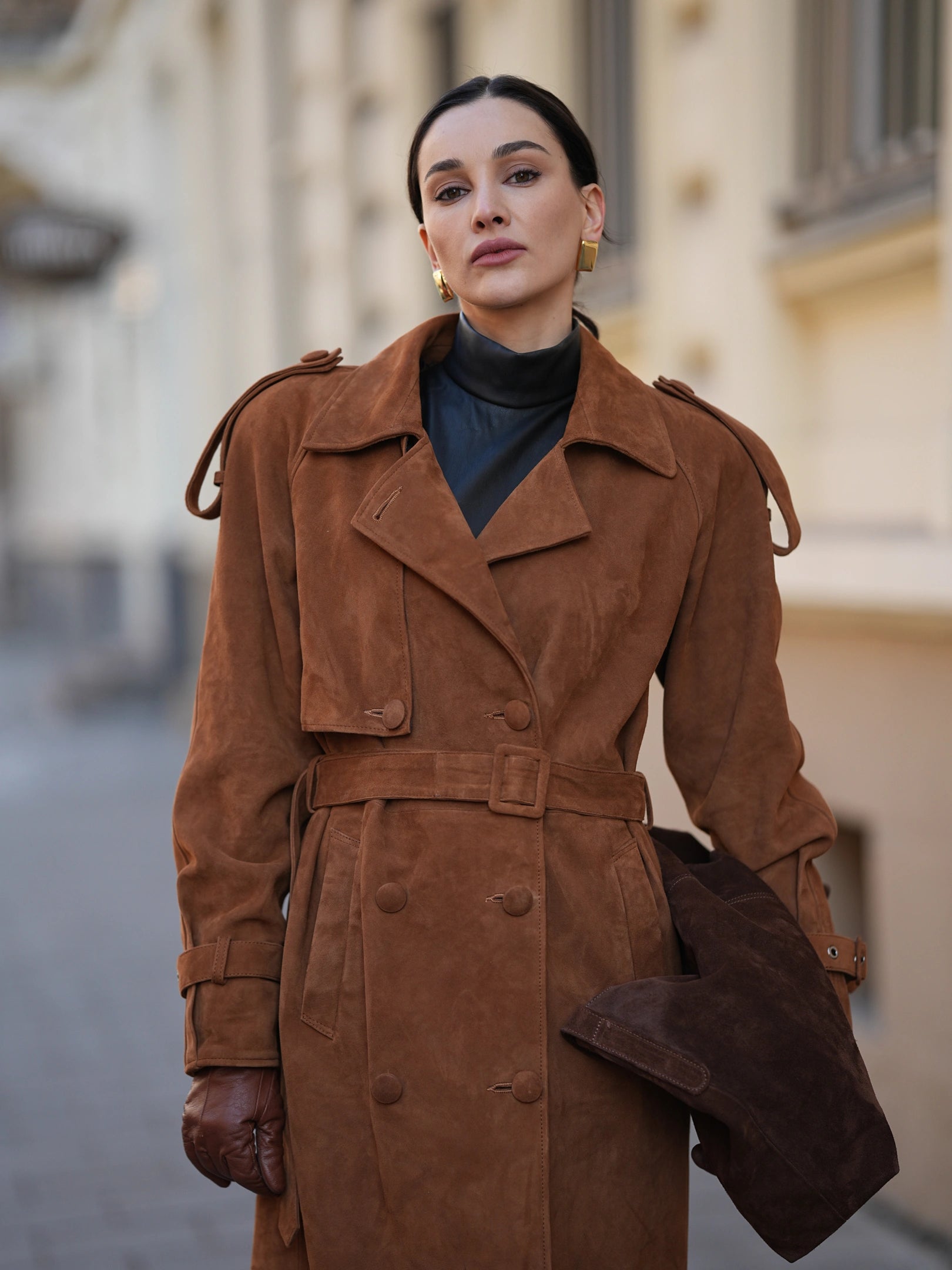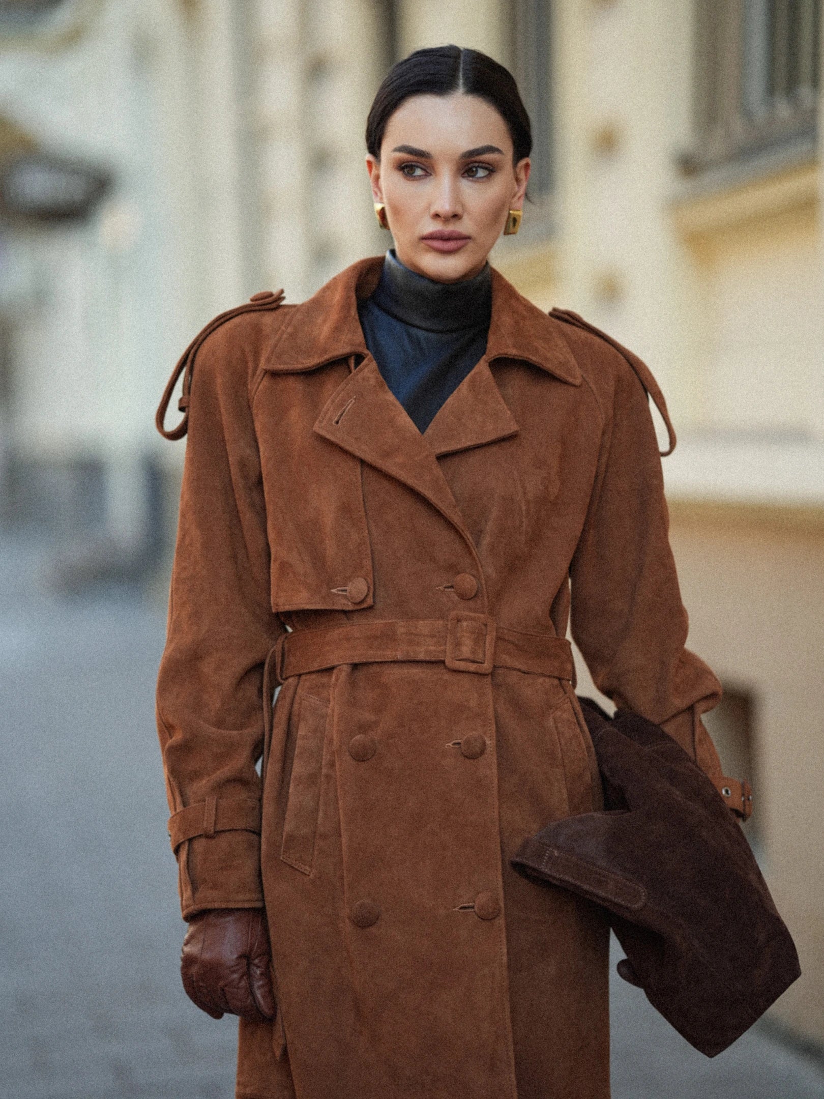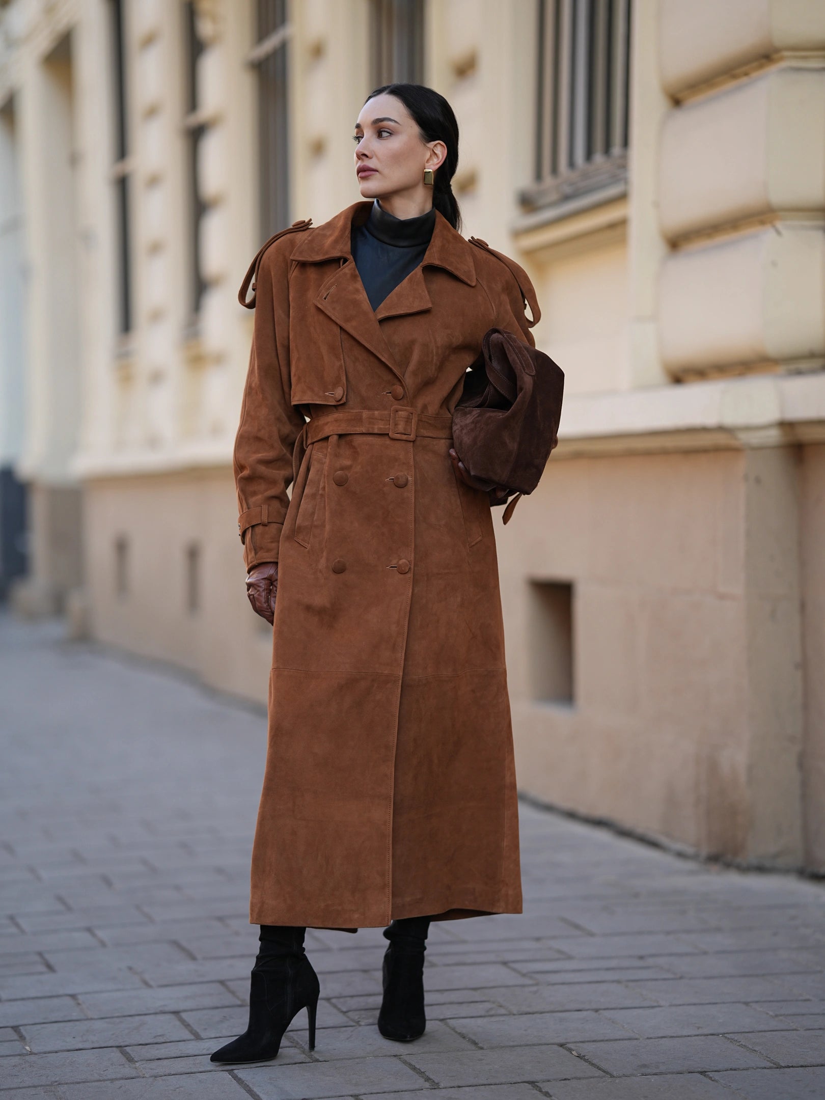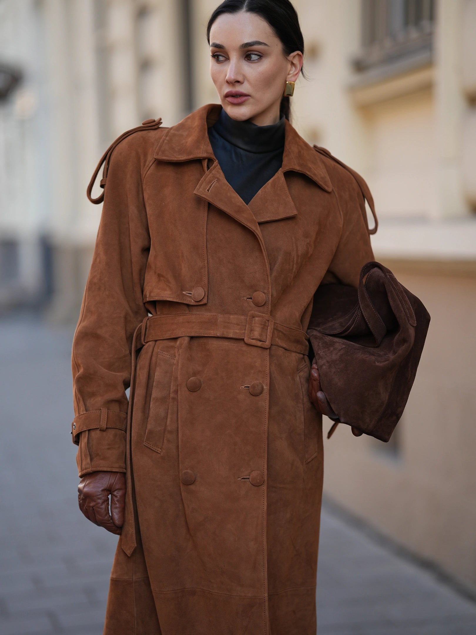 An elegant genuine suede trench coat—an embodiment of elegance and impeccable style. Its deep brown shade adds warmth to the look, while the statement shoulders enhance the silhouette. The maxi length accentuates the refined tailoring, making this trench an ideal choice for aesthetic and confident outfits.