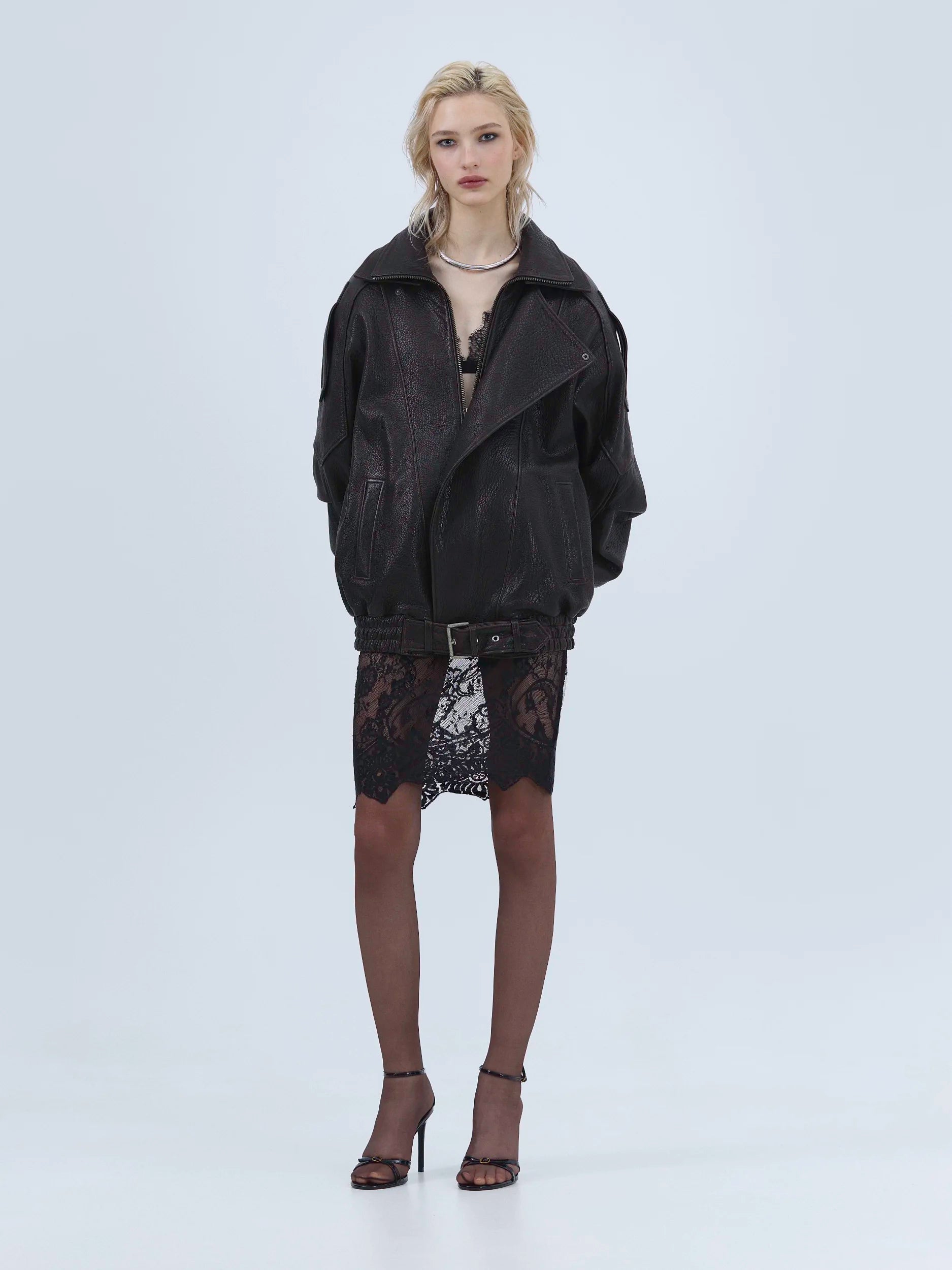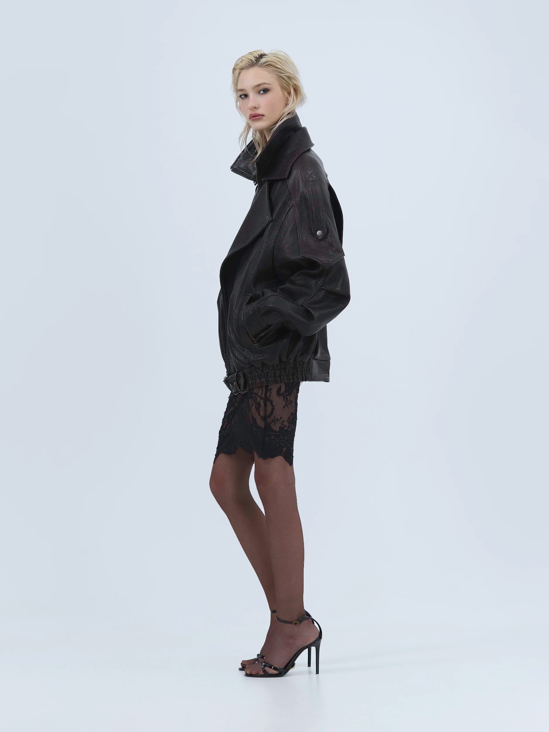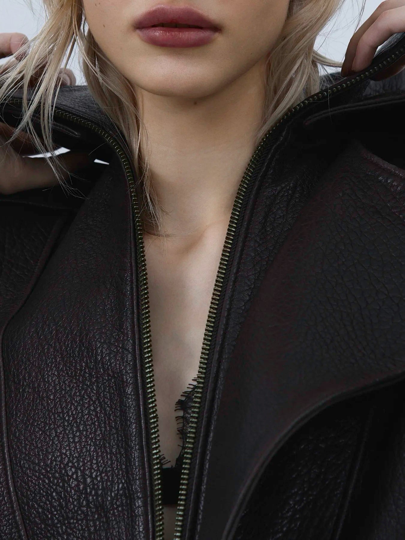 Виконаний із зернистої шкіри з виразною текстурою. Подвійний комір-стійка формує структурований силует та додає характеру.