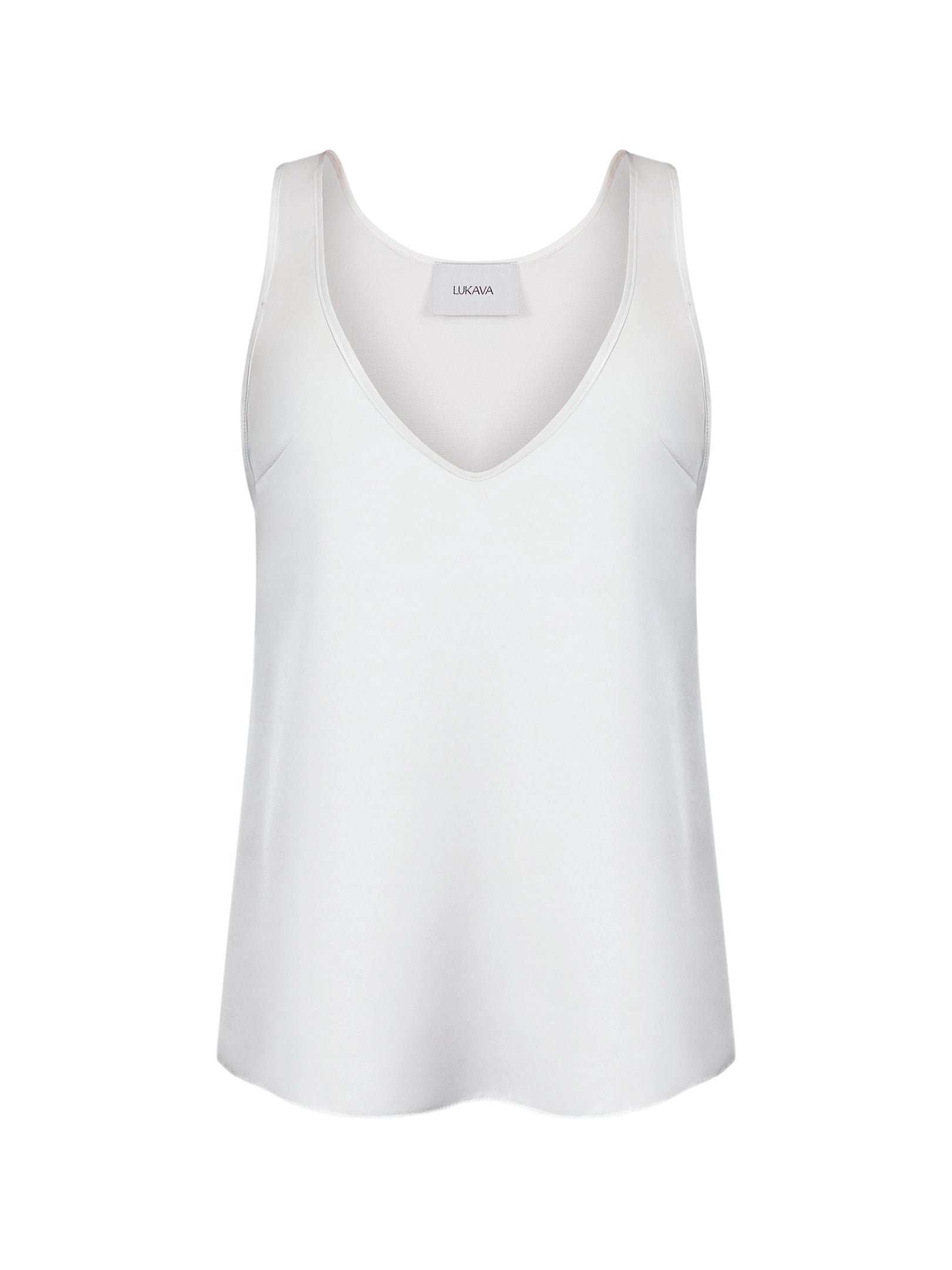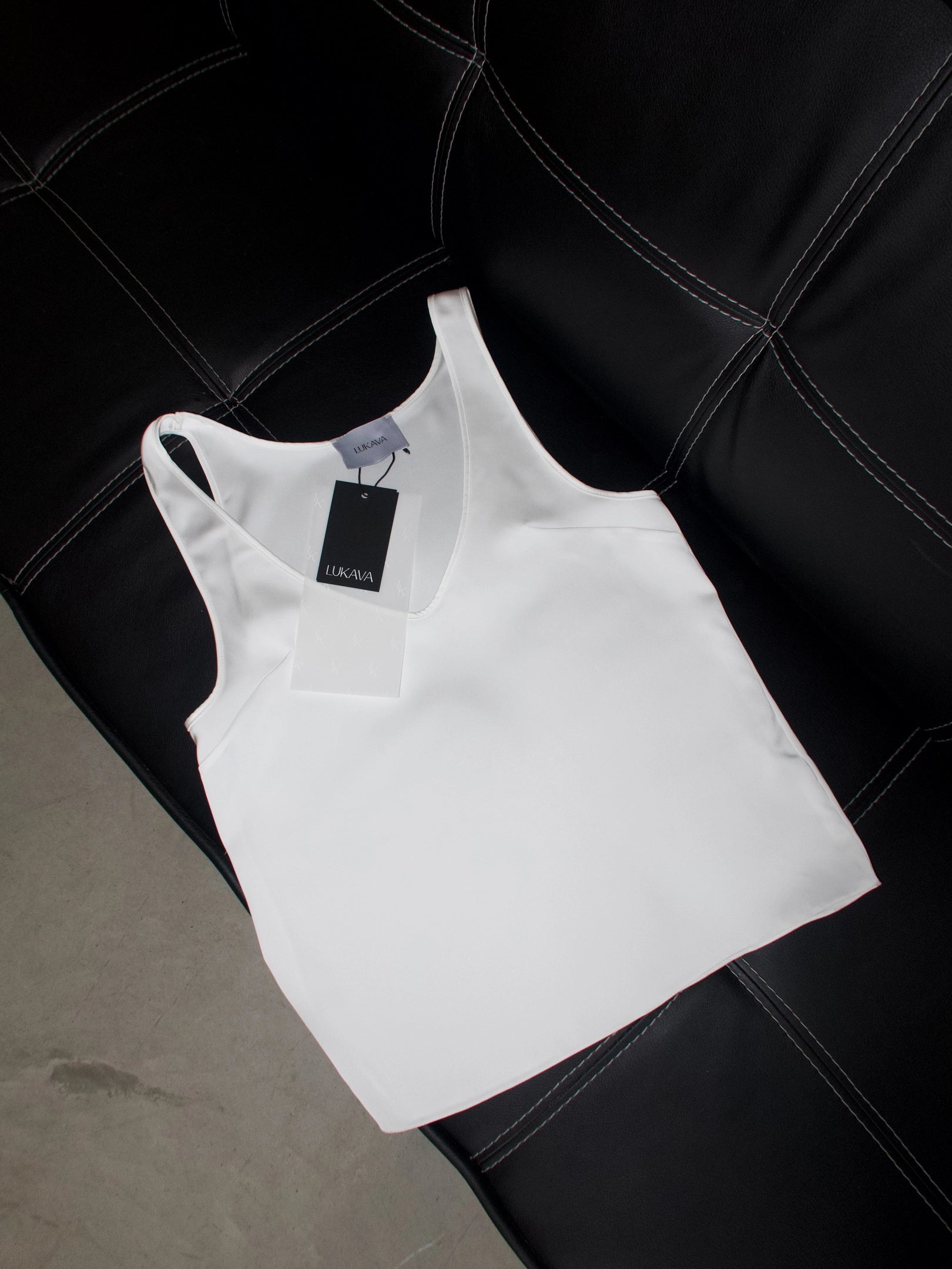Лаконічний топ молочного кольору з глибоким v-вирізом. мʼяка текстура, що підкреслює лінії тіла.