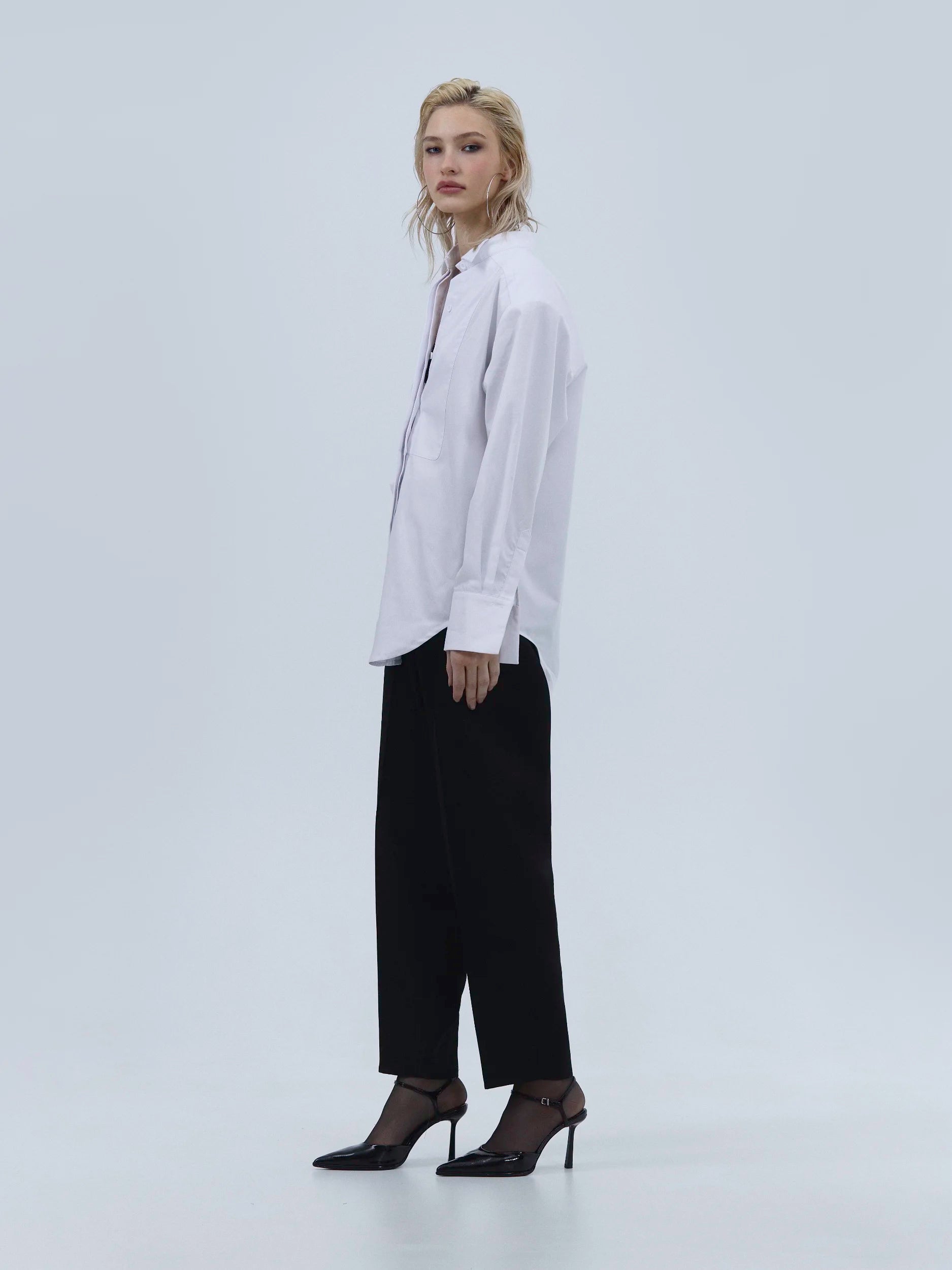 Боковий розріз додає сорочці пластичності та руху, а фірмовий комір підкреслює вишукану стриманість силуету.