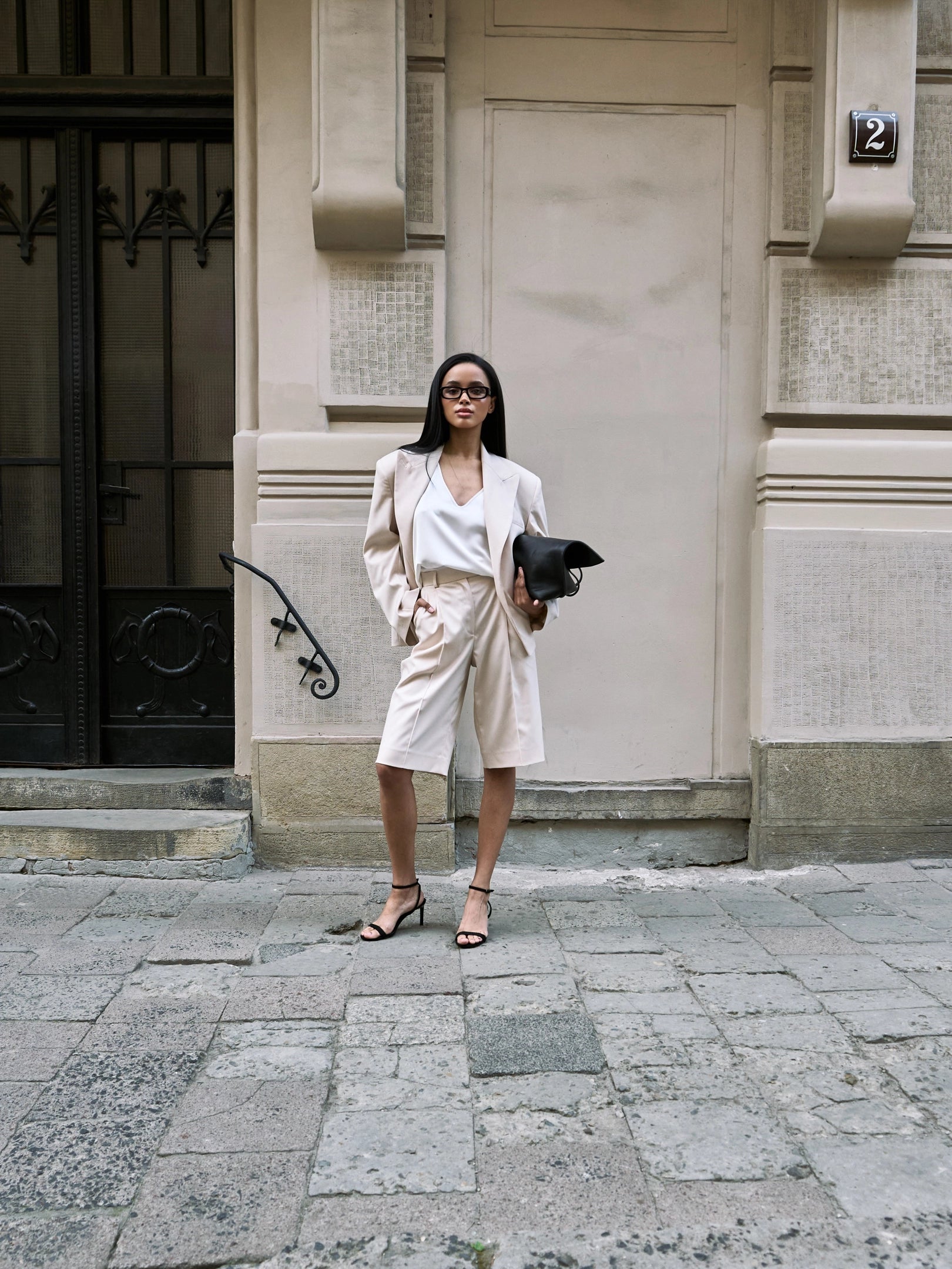Класичні бермуди з високою посадкою та подовженою лінією стегна. Створюють візуально витягнутий силует і легко комбінуються з жакетом або окремими топами.