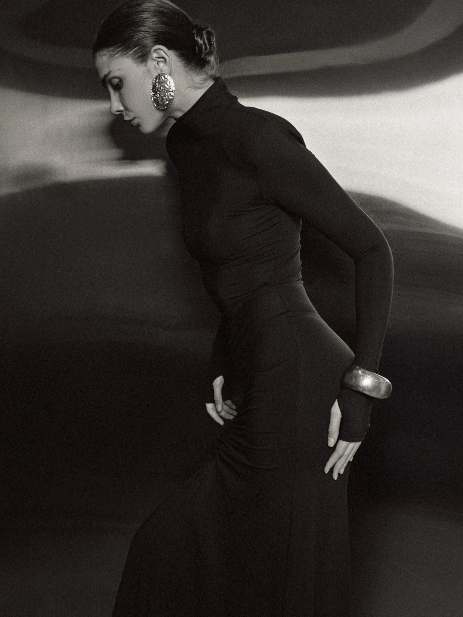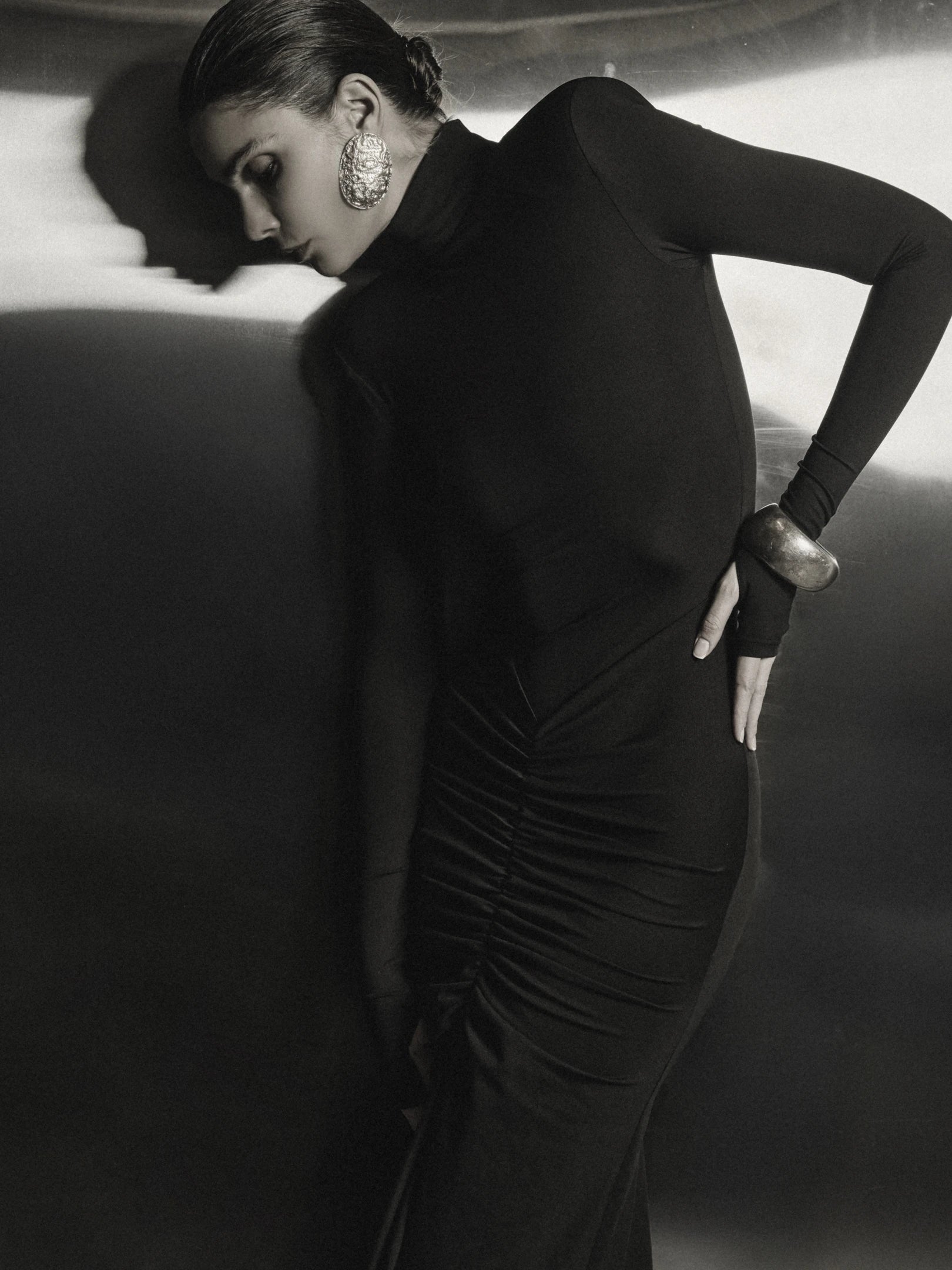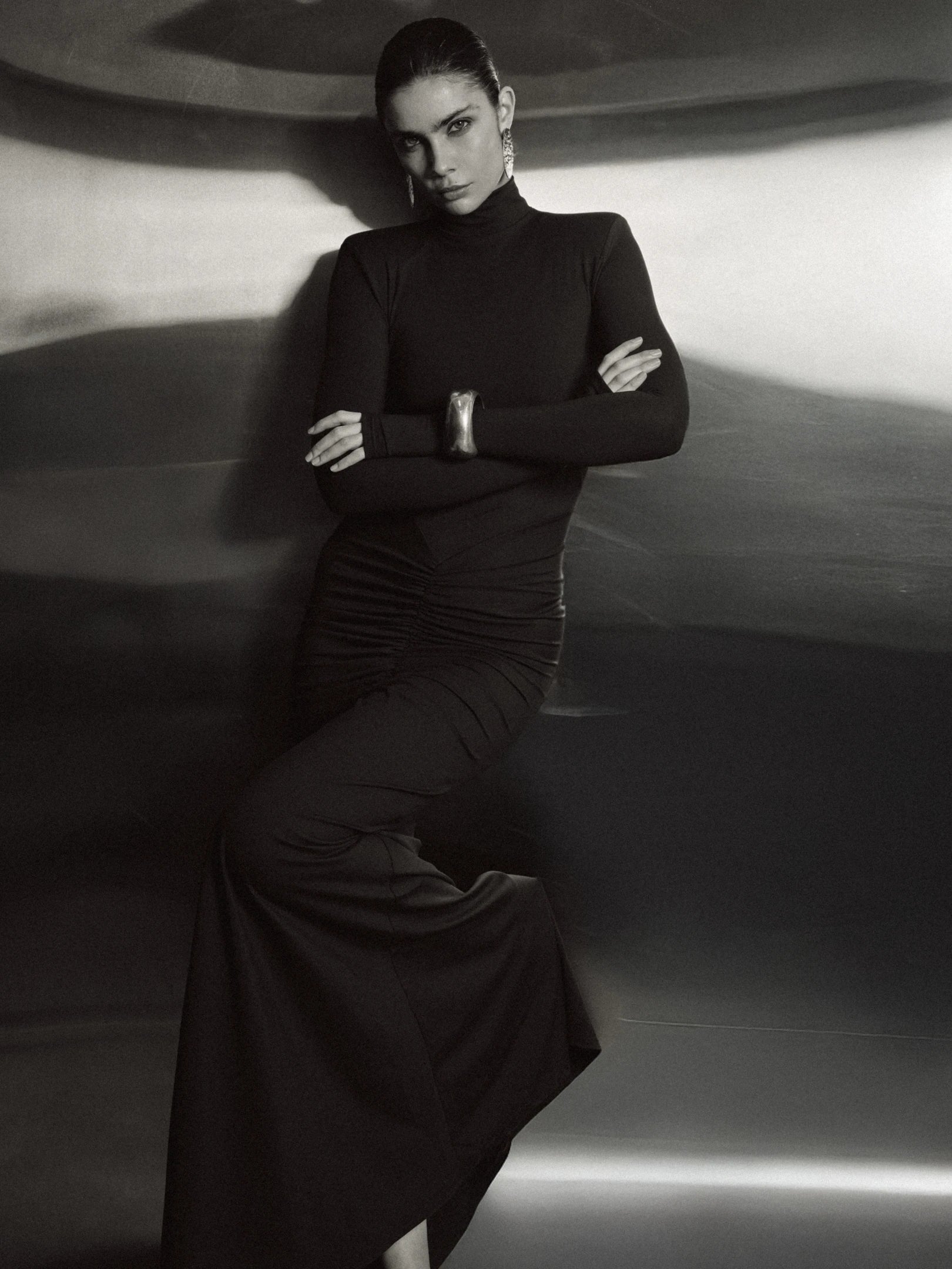 Приталена сукня максі з біфлексу з утепленням, що забезпечує комфорт у прохолодну погоду. Структуровані плечі додають виразності, а м’яка збірка спереду підкреслює силует. Лаконічний дизайн робить її універсальним вибором для особливих подій і вечірніх виходів.