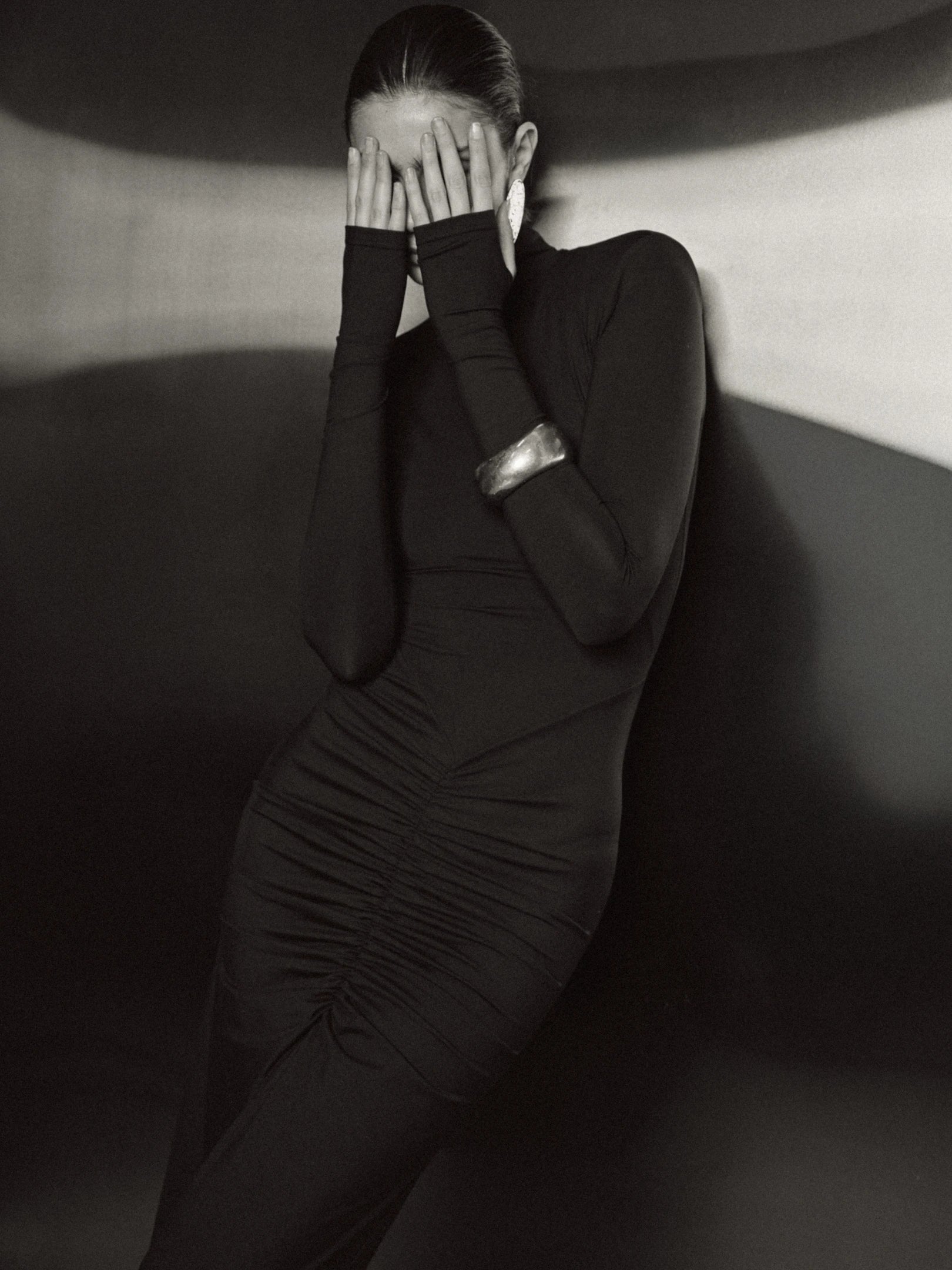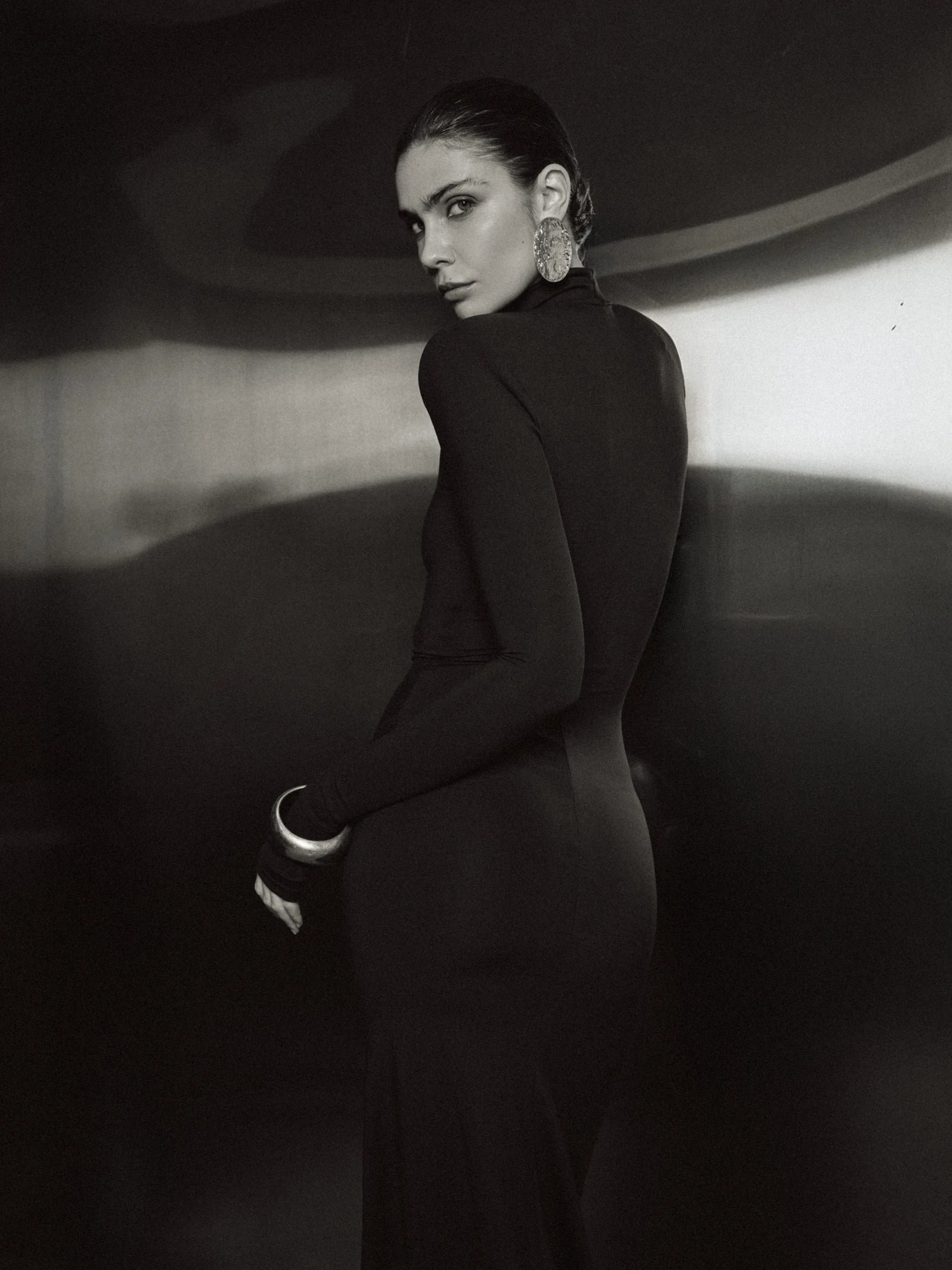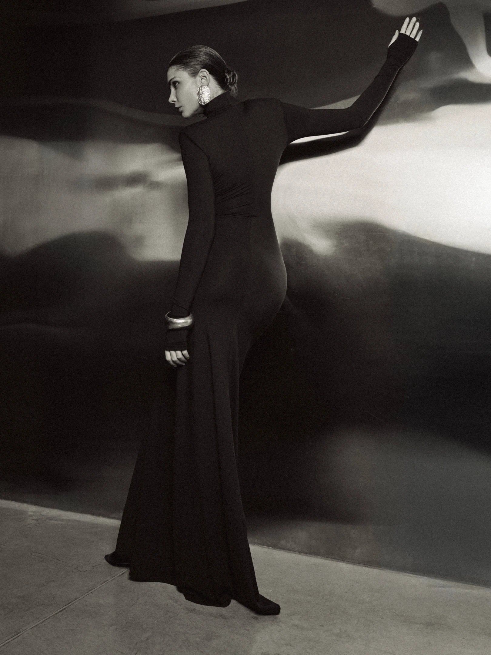 Приталена сукня максі з біфлексу з утепленням, що забезпечує комфорт у прохолодну погоду. Структуровані плечі додають виразності, а м’яка збірка спереду підкреслює силует. Лаконічний дизайн робить її універсальним вибором для особливих подій і вечірніх виходів.